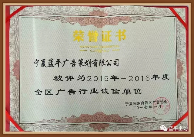 熱烈祝賀寧夏藍(lán)平廣告策劃有限公司(藍(lán)平企劃)被評(píng)為2015年-2016年度全區(qū)廣告行業(yè)誠(chéng)信單位!