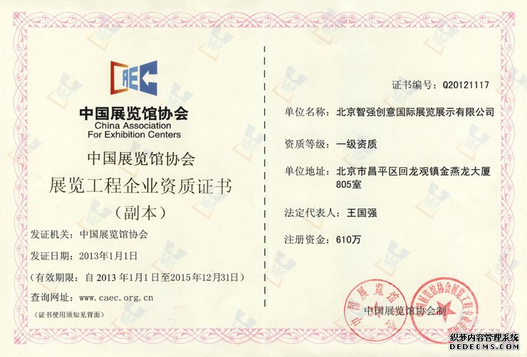 熱烈祝賀藍(lán)平企劃北京分公司獲得中國展覽館協(xié)會(huì)展覽工程企業(yè)一級(jí)資質(zhì)